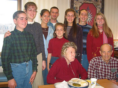 My siblings and I with our grandparents and a couple cousins on Thanksgiving, at the hospital. L-R: Daniel (12), Abigail (25), cousin Amber (16), Joseph (19), Rachel (10), Lydia (16), Susanna (22), cousin Jennifer (18), and Grandma and Grandpa in front.